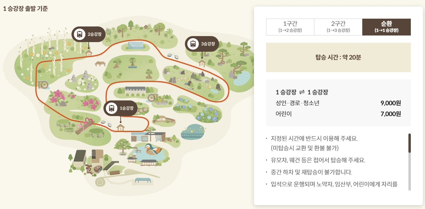 모노레일의 이용 시간은 계절에 따라 다를 수 있으며, 대체로 매일 운영됩니다. 성인과 아동의 요금이 다르며, 자세한 가격은 공식 웹사이트에서 확인 가능합니다. 예약 시 함께 입장할 화담숲의 입장료도 함께 확인하는 것이 좋습니다.